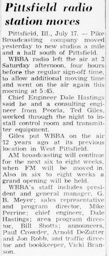 In 1996, after a dispute with Glenn Meyer, a former station owner who still owned the studio and tower south of town, the station relocated to the bank building in downtown Pittsfield, and in 2003 to the American Legion owned building on West Washington where it remained til 2021 when the studio for four years was in Jerseyville. The 1996 dispute forced WBBA AM permanently off the air and programming from then on was only heard at 97.5 FM.